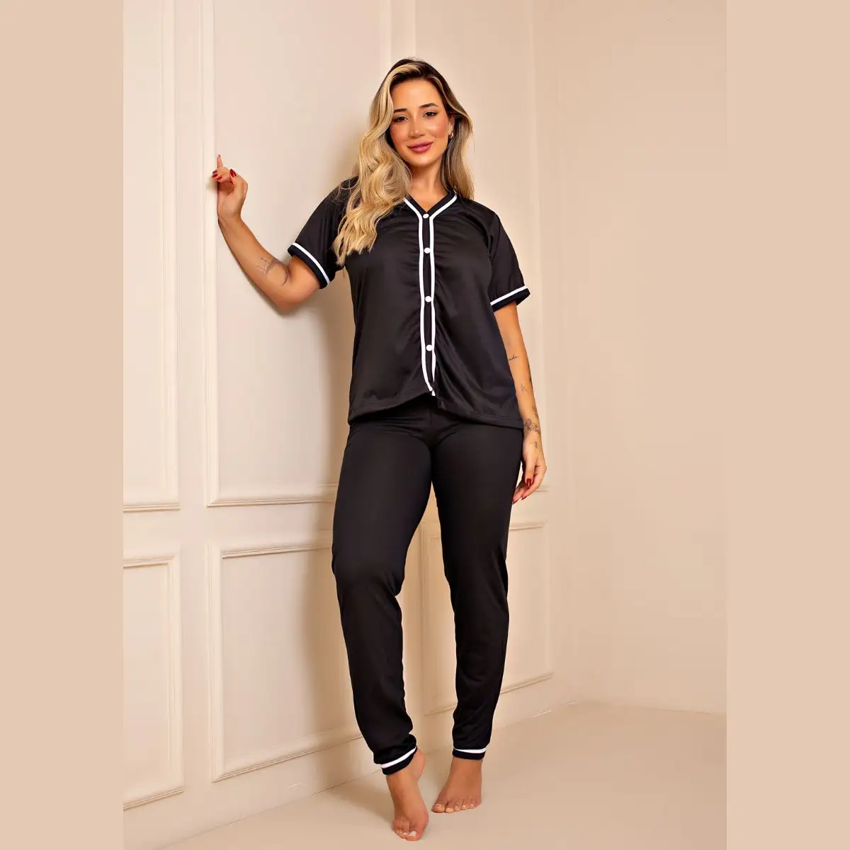 Invista em você mesma. O conforto e o estilo estão ao seu alcance com o Pijama Longo Americano Malha Manga Curto Confortável Blogueira Preto!